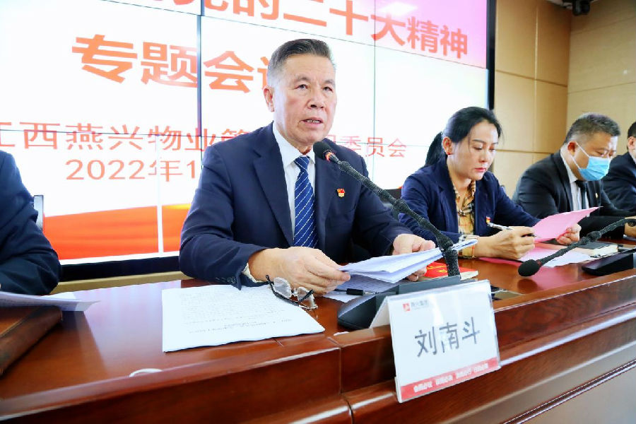 11月18日下午,燕興集團黨委召開學(xué)習(xí)宣傳貫徹黨的二十大精神專題會議。集團黨委書記、副總裁劉南斗主持會議,集團黨委委員、公司領(lǐng)導(dǎo)、贛州中心城區(qū)各支部黨員、入黨積極分子、各項目管理人員及公司各職能部門負責(zé)人參加。