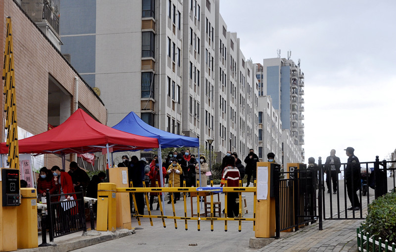 金色春城防控點西區(qū),小區(qū)業(yè)主外出登記和測量體溫的長長隊伍
