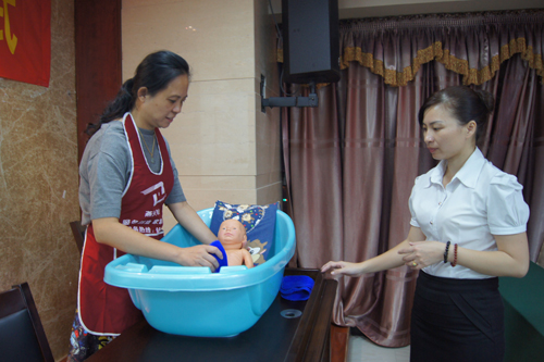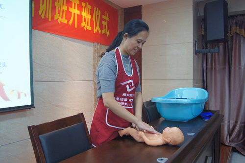 上圖:學(xué)員在做模擬嬰幼兒洗澡實(shí)操