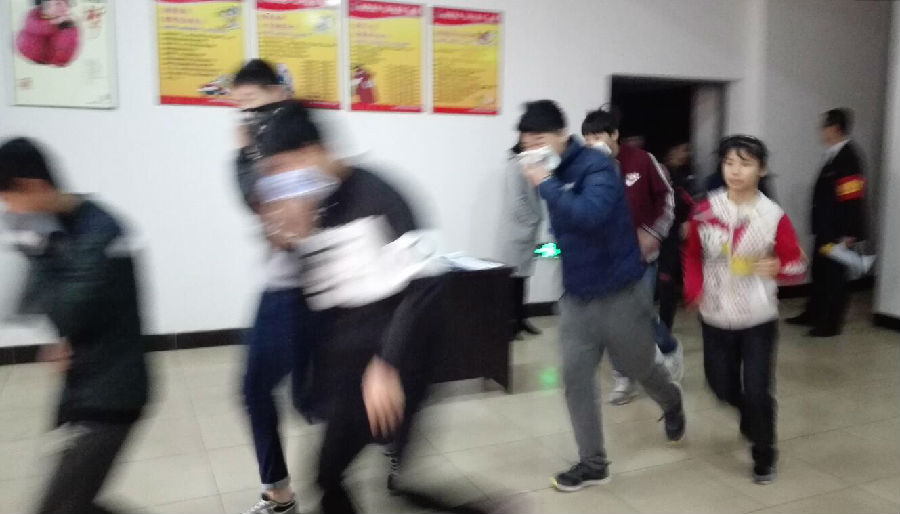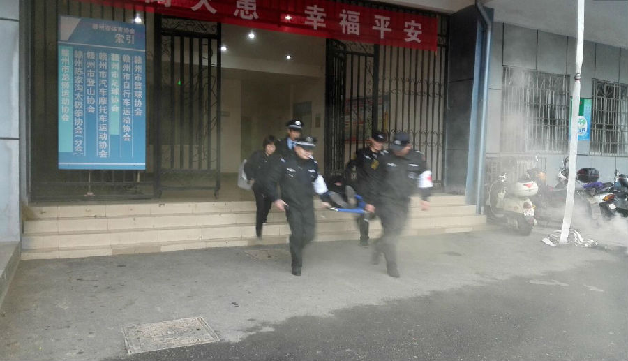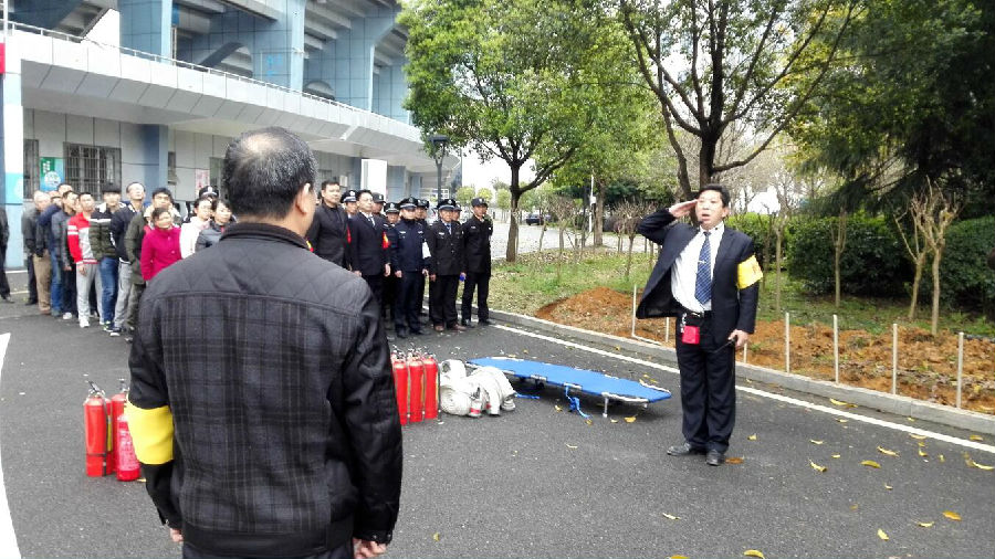 一培訓(xùn)完,參加演練的全體人員整裝列隊(duì),在演練總指揮的一聲令下,演練正式開(kāi)始。這次演練的主要內(nèi)容為通訊報(bào)警、警戒保障、疏散救護(hù)和行動(dòng)滅火?,F(xiàn)場(chǎng)模擬體育中心某處冒出滾滾濃煙,物業(yè)公司接到火警報(bào)告后,立即啟動(dòng)火災(zāi)應(yīng)急處置預(yù)案,通訊聯(lián)絡(luò)組、疏散警戒組、滅火行動(dòng)組、后勤救護(hù)組按照預(yù)案立刻展開(kāi)行動(dòng)。通訊聯(lián)絡(luò)組立即撥打119、120救援電話;疏散警戒組立刻對(duì)各路口進(jìn)行警戒封鎖,組織被困人員沿著設(shè)定的逃生路線有序撤出大樓;滅火行動(dòng)組第一時(shí)間帶著消防水帶、滅火器等消防器材趕到火災(zāi)地點(diǎn),將大火有效控制直至撲滅;后勤救護(hù)組對(duì)在火災(zāi)現(xiàn)場(chǎng)受傷的人員進(jìn)行救護(hù),傷情較重的用擔(dān)架抬出至安全地帶進(jìn)行救治……各個(gè)環(huán)節(jié)臨危不亂,環(huán)環(huán)相扣,操作嚴(yán)謹(jǐn)。