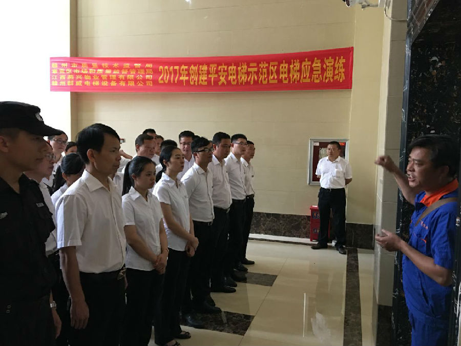 2017年6月是全國第十六個“安全生產(chǎn)月”。2017年6月15日,為貫徹“全面落實企業(yè)安全生產(chǎn)主體責任”為主題的“安全生產(chǎn)月”活動宗旨,創(chuàng)建章貢區(qū)“平安電梯”安全管理示范區(qū),加強對電梯運行的安全管理,提升應對電梯突發(fā)事故的處置救援能力,最大限度保障電梯乘客的人身安全與設(shè)備安全,根據(jù)國家《特種設(shè)備安全監(jiān)察條例》及其他相關(guān)規(guī)定的要求,贛州市質(zhì)量技術(shù)監(jiān)督局、章貢區(qū)市場與質(zhì)量監(jiān)督管理局、江西燕興物業(yè)管理有限公司、贛州群威電梯設(shè)備有限公司聯(lián)合在章貢區(qū)水南新區(qū)公園壹號小區(qū)舉辦“2017年創(chuàng)建平安電梯安全管理示范區(qū)電梯應急救援演練”。贛州市質(zhì)量技術(shù)監(jiān)督局、章貢區(qū)市場和質(zhì)量監(jiān)督管理局、贛州群威電梯設(shè)備有限公司相關(guān)領(lǐng)導,我公司運營部、工程部、小區(qū)服務中心主任、水電工、保安隊長、電梯安全管理人員,及公園壹號小區(qū)業(yè)主代表共計80余人參加了此次演練。