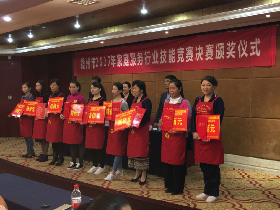 2017年10月27日上午,贛州市2017年家庭服務(wù)行業(yè)技能競(jìng)賽決賽頒獎(jiǎng)儀式在香江灣國(guó)際酒店三樓紫荊廳隆重舉行,江西燕興物業(yè)管理有限公司員工曹運(yùn)莉獲得“嬰兒護(hù)理組”第一名的表彰,舒靜和肖瓊玲分別獲得“家政服務(wù)員組”第一名和第三名的表彰,燕興物業(yè)公司還榮獲“團(tuán)體優(yōu)勝獎(jiǎng)”,展示了燕興人具有的“匠人精神”和專(zhuān)業(yè)能力。