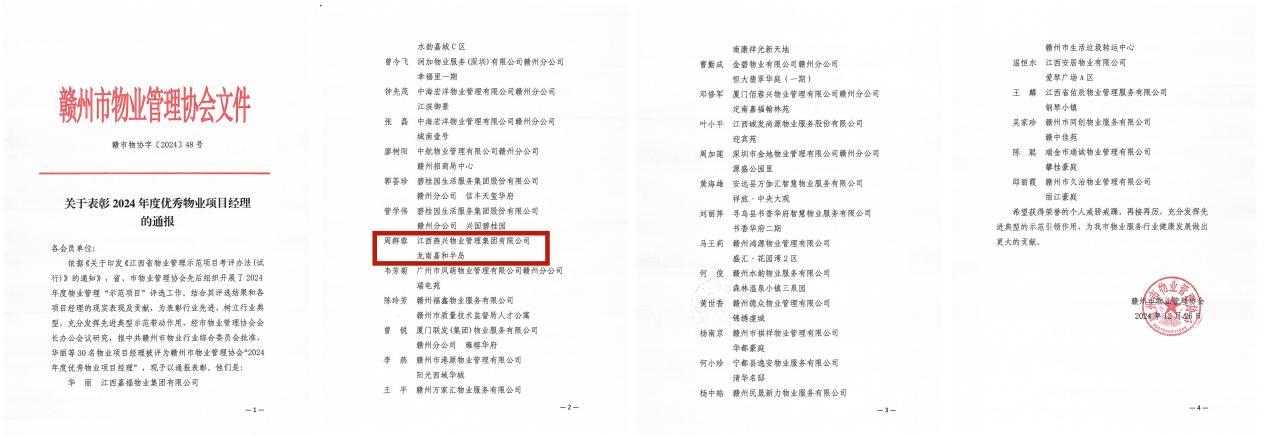 2025年元月7日,贛州市物業(yè)管理協(xié)會第五屆三次會員大會在贛州市格蘭云天國際酒店勝利召開,會上對2024年度優(yōu)秀物業(yè)企業(yè)及個人進行了通報表彰。燕興物業(yè)喜獲贛州市“2024年度優(yōu)秀物業(yè)企業(yè)”“2024年度誠信自律企業(yè)”“2024年度支持文明城市創(chuàng)建先進企業(yè)”榮譽稱號;龍南嘉和半島小區(qū)復(fù)評通過“贛州市優(yōu)秀示范小區(qū)”,項目經(jīng)理周群蓉喜獲“2024年度優(yōu)秀物業(yè)項目經(jīng)理”榮譽稱號,公園壹號小區(qū)物管員李小梅獲得“最美物業(yè)人”榮譽稱號。